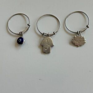 Set of three silver rings with unique charms. Includes a blue bead, a hamsa hand, and a flower charm.