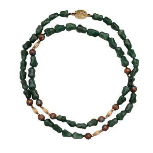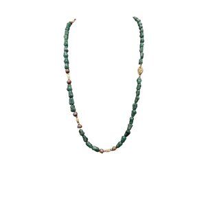 This exquisite Bead Necklace stands out with its well-crafted and extravagant quality. It features red cloisonné floral motif beads, gold tone ribbed oval pieces, and polished Aventurine beads knotted on the expanse of this 30-inch long strand. Each Aventurine bead measures approximately 12.3 mm in size. The tubular part of the tongue clasp is a flat ornate gold tone with a flower design and is marked SILVER on the reverse and it fastens both ends securely. This necklace is incredibly versatile and can be worn on various occasions. Whether dressing up for a special event, adding a touch of elegance to your work attire, or enhancing your everyday look, it's the perfect accessory.