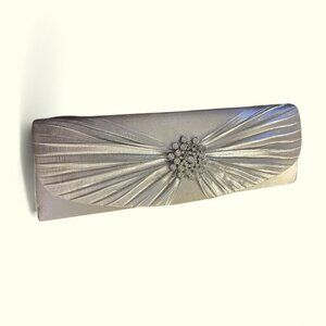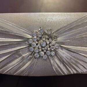 Silver clutch with sparkling flower brooch. It is missing 3 crystals but not noticeable. It can also be used as a crossbody if desired as there is a strap inside. There is also some slight smudges on the inside flap. Perfect for a wedding or party event.