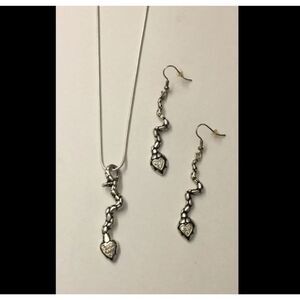 Brand new necklace and earring set done in a cobblestone textured design. The snake “heads” sparkle with heart shaped rhinestone clusters. The 2 inch silver plated pendant is 2 inches in length and hangs on an 18” silver snake chain necklace. It has a 3 inch chain extender and lobster claw clasp closure. The 3 inch dangle earrings have ear wire hook closures.