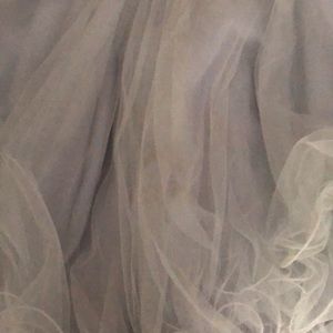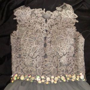 Short Cocktail dress. Silver with rhinestones and floral lacing on the top. Scarf included. Some blemishes but not noticeable.