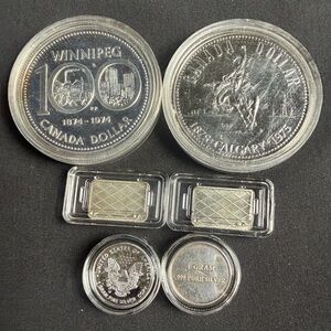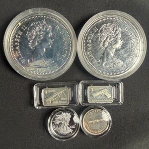 A collection of silver coins featuring various designs and sizes. Includes x2 Canadian Dollars and x4 1g cute Silver collectibles that are worth 3-5x their melt value, everything also comes in protective cases!