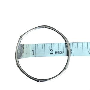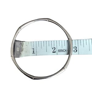 Silver colored bangle bracelet. Preowned. Has some scuffs and wear. Material and brand unknown.