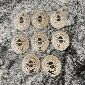 Set of eight silver concho buttons. Intricate design with scalloped edges.