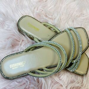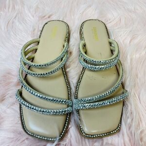 Step into elegance with these silver and cream sandals, featuring a chic multi-strap design adorned with sparkling rhinestones. Perfect for adding a touch of glamour to any outfit, these sandals offer both style and comfort for warm weather wear.