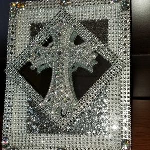 Silver cross on a 5x7 frame, surrounded with silver bling wrap and rhinestones. The background is a mirror.