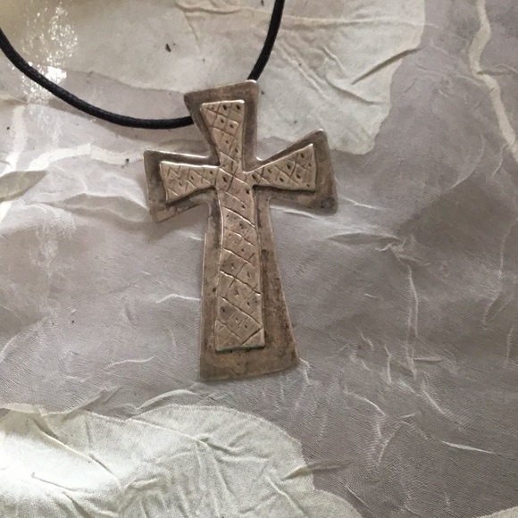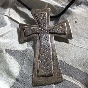 Large silver cross made by a southwest artist in early 1990s. Originally sold for about $120. This is not 925 silver. Slight bend in bottom half of cross.
