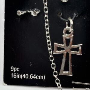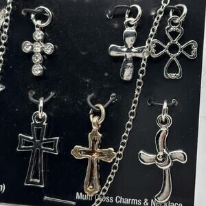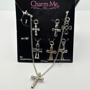 Silver Cross Charm Me Necklace. This is an adjustable piece that fits around 16 in or near. This has 7 crosses that you can switch out on your outfit choice!!