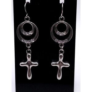 Silver Cross Dangle Earrings With Rhinestone Accents & Circular Detailing For Wo