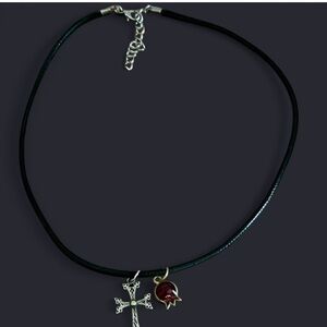 This striking necklace showcases a silver cross and pomegranate pendant on a sleek black cord. The combination of silver, gold and black creates a timeless look. New, unisex