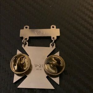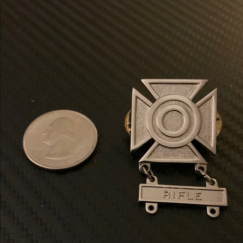 Elegant silver cross pin with 'Rifle' inscription, perfect for adding a touch of sophistication to any outfit.