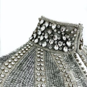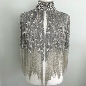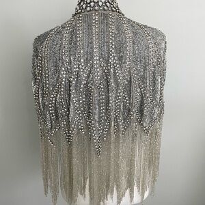 Introducing our exquisite Silver Luxury High Neck Hand-Beaded Crystal Cape, adorned with shimmering silver beaded fringe trimming. This statement piece exudes opulence and sophistication, ensuring you shine with every step.