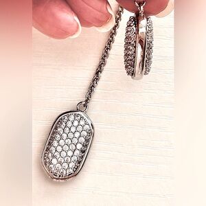 Long Sleek Silver & Crystal Pave drop lariat necklace with adjustable length. Silver rhodium plated metal that resists tarnishing. The stunning crystal pave piece is styled similarly to the KS pave diamond necklace.