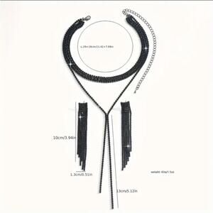 Silver crystal rhinestone drop tassel y lariat necklace with matching earrings also available in gold and black.