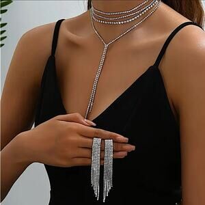 Silver Crystal Y Lariat Choker Matching Earrings Rhinestone Necklace New …