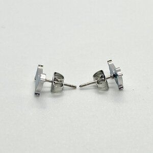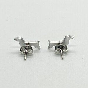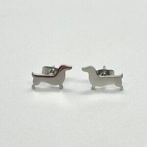 A pair of silver dachshund stud earrings. Made of silver tone stainless steel. Butterfly backings. Measures approx. .5" in length and .25" in height; shown next to a penny to help indicate size.