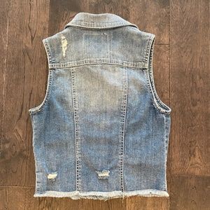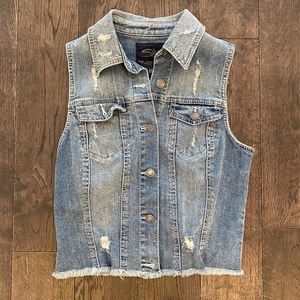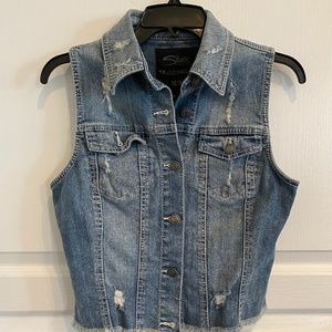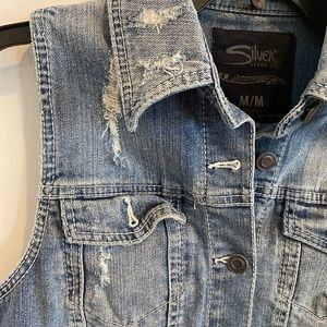 Silver brand Denim Vest, Destructed style, light wash. Size M, NWOT. Fitted, cropped with fringe around the edge. Measures: 16 1/2" across bust and 18 1/2" length.ek