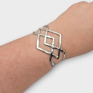 This striking silver-tone cuff bracelet features a bold open diamond pattern inspired by both modernist design and southwestern geometry. The interlocking shapes create a sculptural look that’s effortlessly chic and easy to style — perfect for layering or wearing solo as a statement piece.