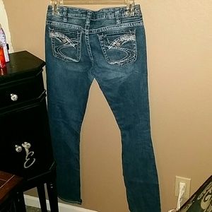 Size 30 ultra low rise silver jeans. Bottoms have some wear in them but still in good shape. Thanks for stopping by.