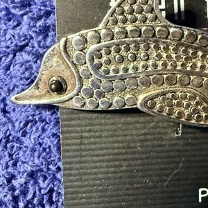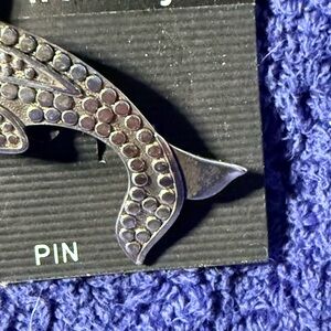 Elegant silver dolphin pin by. Perfect for adding a touch of marine charm to any outfit.