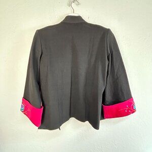 Elevate your wardrobe with this Silver Dragon De Oriental Classic jacket, a stunning blend of traditional Asian aesthetics and wearable art. The piece features a Mandarin collar, front gold-tone buttons, and ornate embroidered floral trim at the collar and cuffs in vivid red. Crafted with attention to detail, this jacket makes a sophisticated statement in any setting.