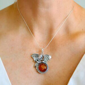 Silver Dragon Pendant Necklace - Baltic Amber and Sterling Silver