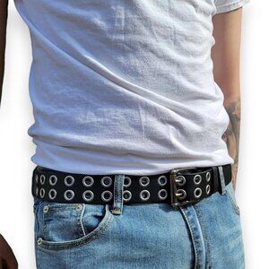 Black faux leather belt with double row silver grommets studded belt, straps for a bold touch of style that works for both men and women. Perfect for Y2K, Rock 'n' Roll, Streetwear, or Moto looks, this versatile piece is perfect for accessorizing your attire! With a sturdy design and secure double-prong buckle, you can wear it high-waisted or low on the hips. From everyday wear to concerts and rebellious fashion statements, this belt adds an effortless touch of cool to any aesthetic.