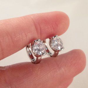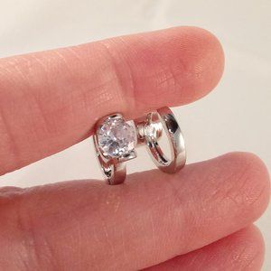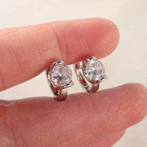 Beautiful crafted women's classic elegant zircon hoop huggie earrings silver plated w/ round clear white simulated diamond topaz zircon gemstones. Top quality, high polished shine, brand new, never been worn. Lead, nickel free. These earrings sparkle.