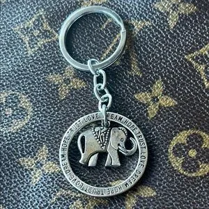Silver keychain featuring an elephant design with engraved words.