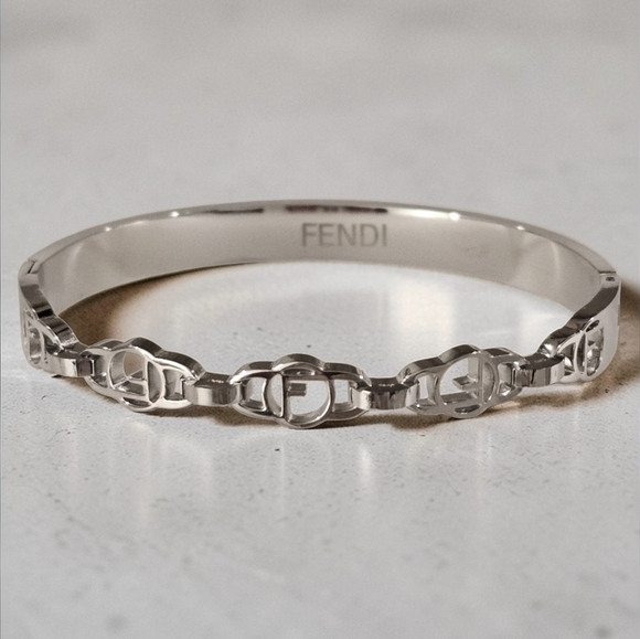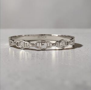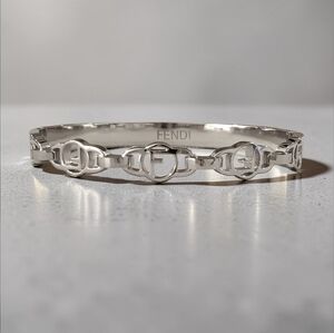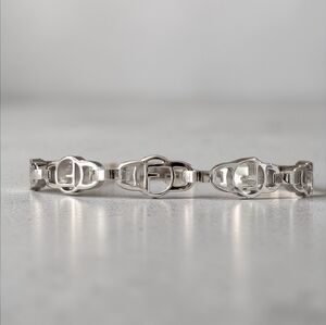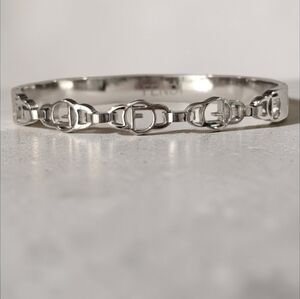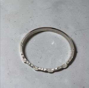 Gorgeous white gold plated over stainless steel. Hidden closure. Appx. 7.5" around. Appx. .25" wide.