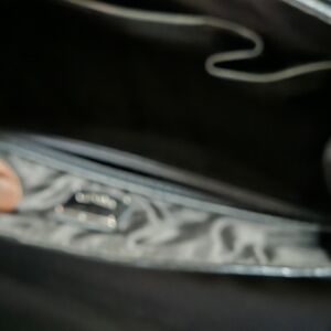 Stylish silver handbag with embossed design. Features a sleek handle and metallic clasp.