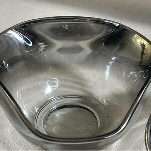This vintage set of silver fade nut candy bowls is a beautiful addition to any mid-century modern collection. The round glass bowls feature an elegant glass production style and are unmarked for brand authenticity. The bowls are perfect for serving candy, nuts, or other small treats