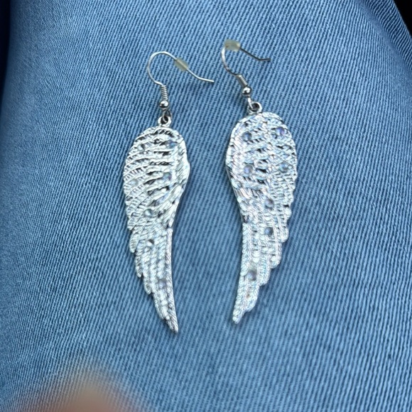 These stunning silver earrings feature a detailed feather wing design with intricate ridges that shimmer in the light. The earrings hang gracefully from simple fish hook ear wires, offering a vintage or bohemian style. Their bright, ethereal quality makes them a captivating accessory for any occasion.