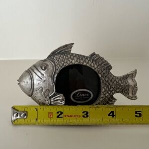 Vintage fish-shaped photo frame in silver. Perfect for adding a nautical touch to your decor. It is small- notice measurements.