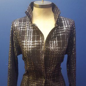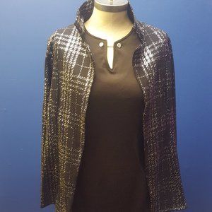 Walk into the boardroom in style with this silver foil tartan blazer. Add your favorite leather black dress for an edgy look.