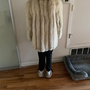 Silver fox jacket in excellent condition, clean lining. Made in Korea, size 12: Jacket hits knee length, has pockets, and very warm.