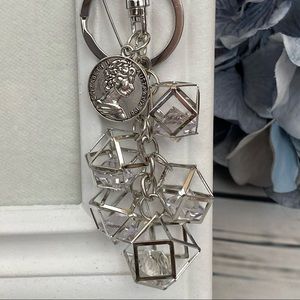 This keychain is even more stunning in person! Geometric orbs hang from the keychain, caging diamond shaped crystals. There is a coin charm near the top of the cluster. This would be a great gift!