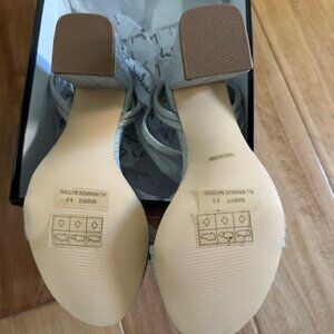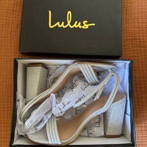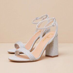 The Lulus Mabrie Silver Glitter Ankle Strap High Heel Sandals will be the perfect statement-making finish to any party-ready look! These glittery heels have a faux leather construction that shapes an almond-shaped footbed and a wide, seamed toe strap. A matching, sturdy heel strap supports an ankle strap that secures with a shiny silver buckle, all atop a classic block heel.