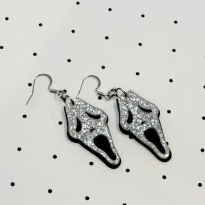 Silver Glitter Ghostface Mask Earrings Stainless Steel Hooks Scary Movie 90s