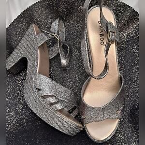 Elevate your party look with these stunning Silver glitter block heel sandals from Bamboo. The slip-on design features an open toe and adjustable strap for a secure fit. The mid-height heel and 1 inch platform provide comfort and style. These heels are perfect for any occasion, from a night out to a formal event.