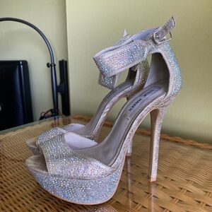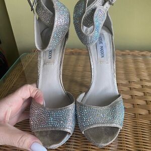 Step out in style with these stunning Steve Madden silver glitter rhinestone platform heels. Perfect for any special occasion, these shoes add a touch of glamour to your outfit.