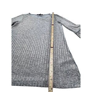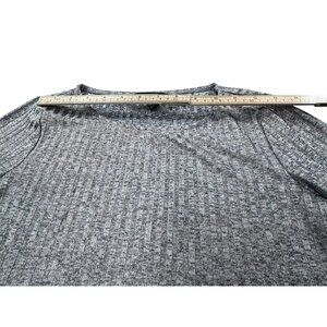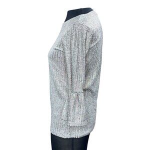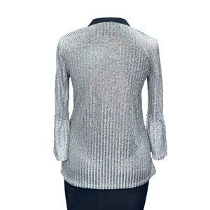 This silver glittery ribbed top features elegant bell cuffs, offering both style and comfort. Its unique texture and shimmering appearance make it a standout piece for professional settings. The 3/4 length sleeves add versatility, allowing it to transition seamlessly from office wear to evening outings.