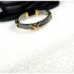 Two Tone Silver & Gold Tone Twisted Metal Bracelet Cuff with Xs Deadstock New in pack. Materials unknown and age unknown. Not branded. Cuff has weight to it. One size fits most.