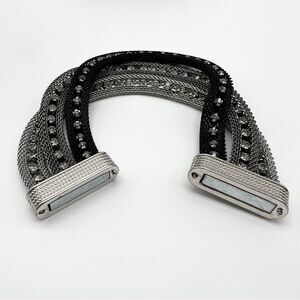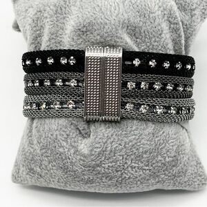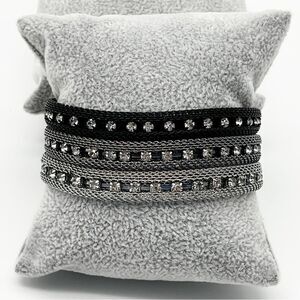 Silver Gray Black Tone Mesh Clear Rhinestone 3 Strand Cuff Statement Bracelet 7”