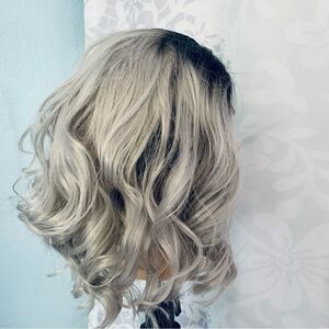 Pretty silver/gray ashy white with black roots synthetic wig. Realistic lace part. Bouncy loose beach wave curls. Heat friendly fibers can be straightened or curled. Uncut lace front. Adjustable strap& combs. Approx length from crown 18”. New without tags. Unbranded Size Average