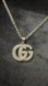 This stunning GG rhinestone silver pendant adds a touch of elegance to any outfit. Perfect for any occasion. 20in Chain included.