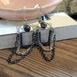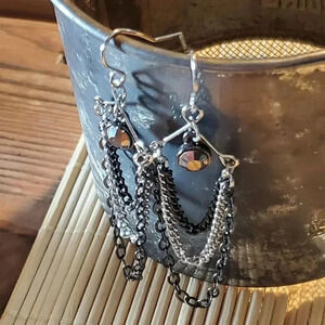 Silver Gunmetal Grey Handcrafted Triple Chain Crystal Dangle Earrings