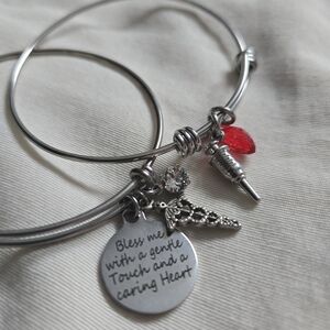 Elegant silver charm bracelets featuring healthcare accents. Includes blood drop (red stone), syringe, CZ, "Bless me with a gentle touch and a caring heart" and caduceus symbol charms.
