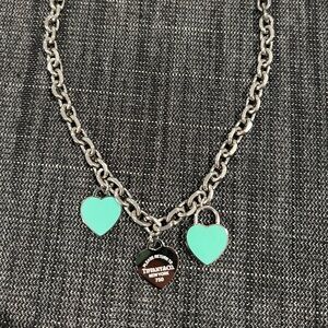 Elegant necklace featuring silver and turquoise heart charms. Perfect for adding a touch of sophistication to any outfit.