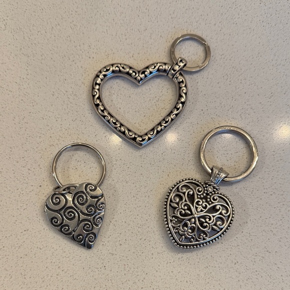 Brighton Set of three silver heart-shaped keychains with intricate designs. Perfect for adding a touch of elegance to your keys.